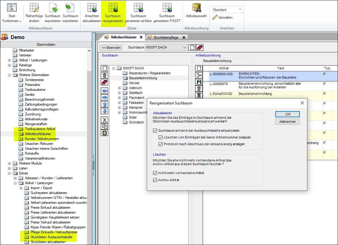Über die Funktion „Suchbaum reorganisieren“ können nun Artikeleinträge in Ihren Artikelsuchbäumen ersetzt oder gelöscht werden.