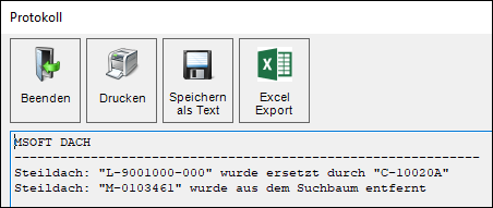 Bei der Funktion „Suchbaum reorganisieren“ wählen Sie „Suchbaum anhand der Austauschtabelle aktualisieren“ und darunter kann optional eingestellt werden, ob auch Einträge gelöscht werden, wenn als Zielartikel ein leerer Eintrag angegeben ist. Die Funktion überprüft dabei alle vorhandenen Suchbäume. Optional erhalten Sie auch ein Protokoll über alle vorgenommenen Änderungen.