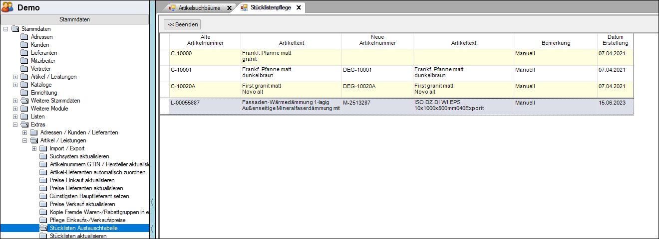 Die Bearbeitung wird über die Stücklistenaustauschtabelle gesteuert. Einträge dieser Tabelle werden für die neue Funktion verwendet um Ihre Artikelsuchbäume zu pflegen.
