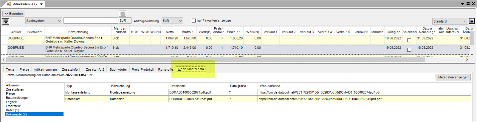 OMD-Artikel haben im Fremdkatalog einen zusätzlichen Reiter „Open Masterdata“. Dieser enthält vom Lieferanten bereitgestellte Zusatzinformationen, wie z.B. Bilder und Verknüpfungen auf Dokumente. Bei Aktualisierungen werden diese Informationen auch optional mit aktualisiert.