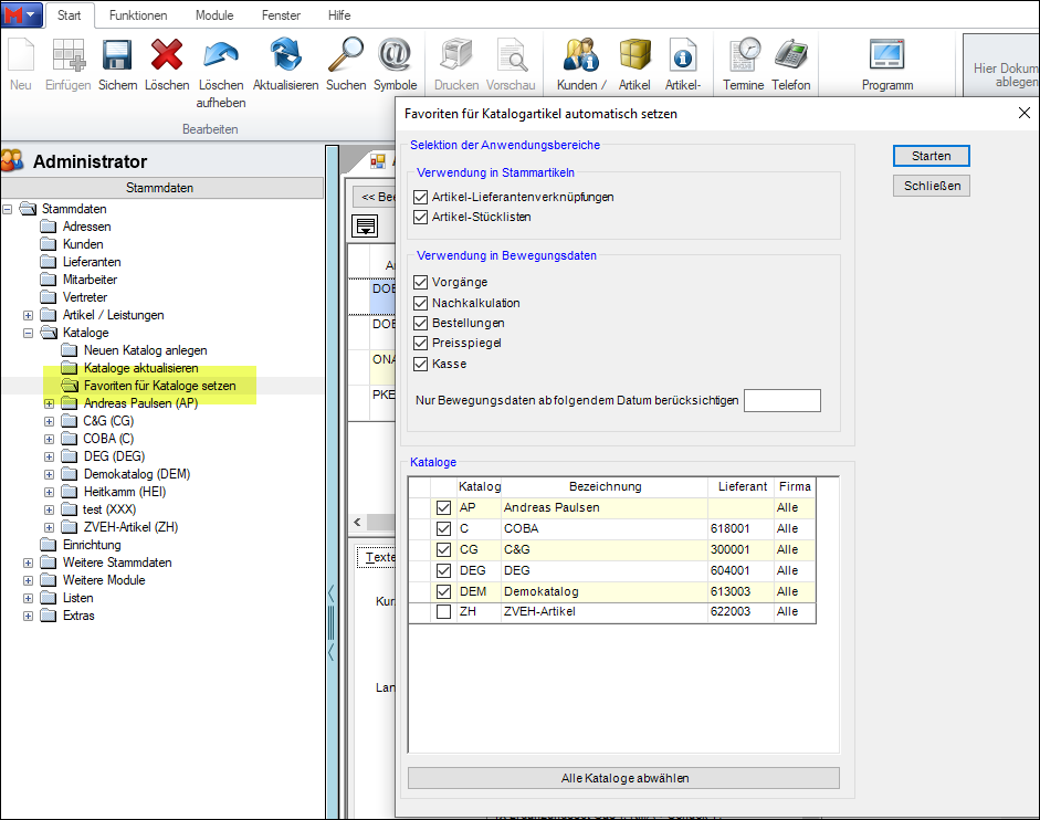 Dazu unterzieht man seine Artikel einen Prüflauf der aufgerufen wird in den Stammdaten mit dem Menüpunkt Kataloge-„Favoriten für Kataloge setzen“. Dabei werden die Artikel geprüft, ob diese bereits im System verwendet wurden. Da sehr alte Daten eher weniger sinnvolle Ergebnisse liefern kann für den Lauf das Datum eingeschränkt werden. Ebenfalls kann die Prüfung auf verschiedene Bereiche wie Vorgangspositionen, Vorgangspositionen-Stücklisten, Nachkalkulation, Bestellungen, Preisspiegel, Kasse und die verschiedenen Fremdkataloge eingeschränkt werden.