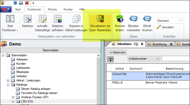 Mit der neuen Funktion „Aktualisieren mit Open Masterdata“ werden die markierten Artikel im Fremdkatalog vom Lieferanten aktualisiert.