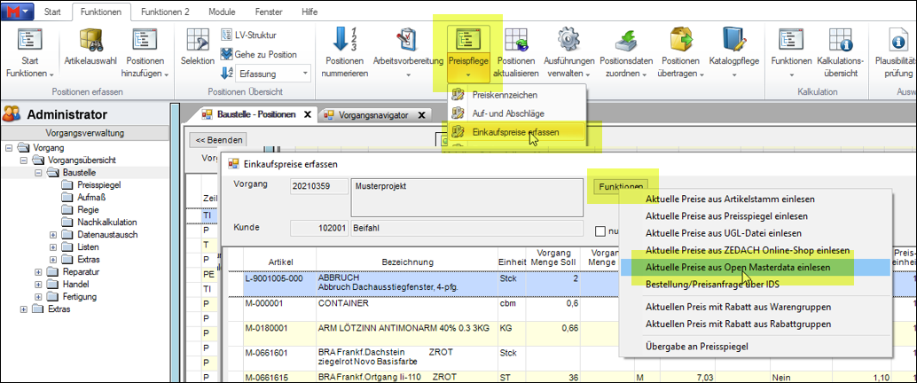 Baustellenvorgänge: Vorgangspositionen Einkaufspreise mittels OMD aktualisieren