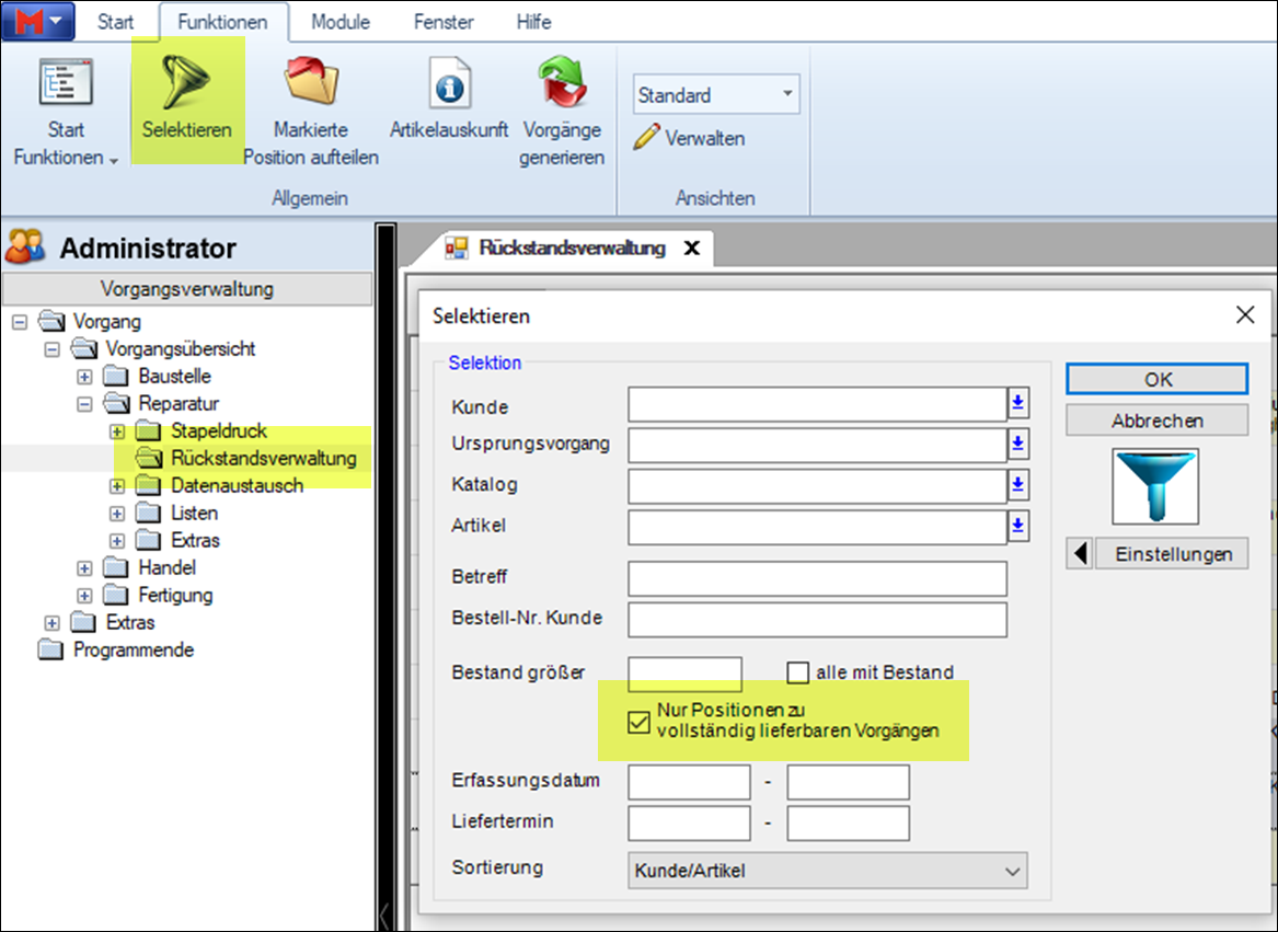 In der Selektion unter der Rückstandsverwaltung werden mit der Auswahl "Nur Positionen zu vollständig lieferbaren Vorgängen" nur Rückstandspositionen von Vorgängen angezeigt,
