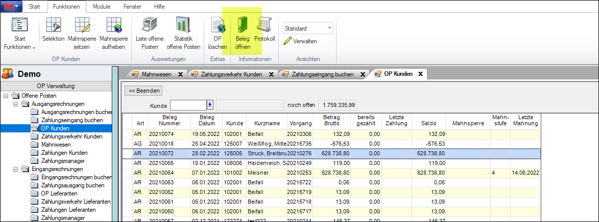 Sind Belege zu offenen Posten in ELO oder DMS archiviert können diese aufgerufen werden mit der neuen Funktion „Beleg öffnen“ aus dem Abschnitt Information.
