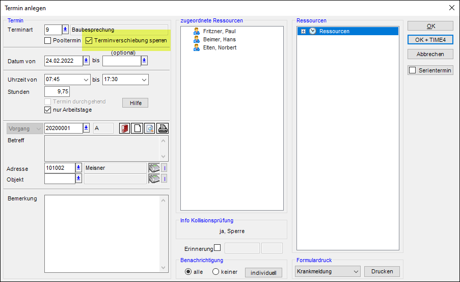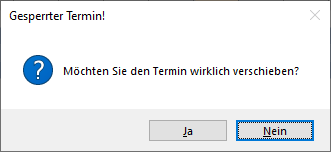 Bei der Erstellung und Änderung eines Termins kennzeichnet die Checkbox „Terminverschiebung sperren“ den Termin als zeitlich festgeschrieben. Im Terminkalender kann ein Eintrag nur geändert werden, indem der Termin direkt geöffnet wird. Beim Verschieben per Drag&Drop weißt eine Sicherheitsabfrage auf die Sperre hin.