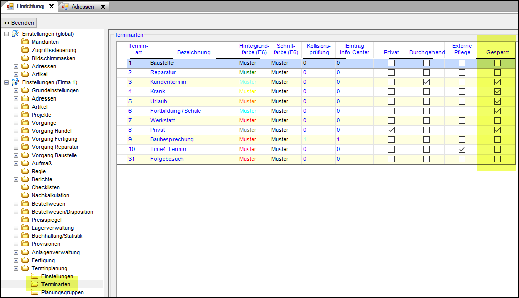 Terminarten können in der Einrichtung mit der Eigenschaft „Gesperrt“ vorbelegt werden damit dazu erstellte Termine nicht verschoben werden