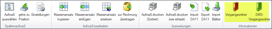 Im Aufmaß, also Erfassungsliste, Positionsaufmaß, Spaltenaufmaß, Zuschnitt, Gerüst und Regie können Sie nun über die Ribbonbar im Abschnitt Information auf Dokumente aus dem Vorgangsordner bzw. Archivordner (DMS, ELO) direkt zugreifen.