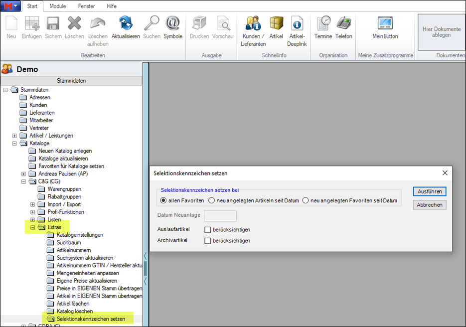 In den Tabellen zu Fremdkatalogen gibt es die Spalte Selektion um einen Artikel zu kennzeichnen. Die Selektion wird bedienerspezifisch gespeichert. Unter Extras haben Sie nun weitere Möglichkeiten das Selektionskennzeichen zu setzen. Zur Auswahl stehen alle Favoriten, neu angelegte Artikel seit einem Datum und neu angelegte Favoriten seit einem Datum. Weiter können optional auch Auslauf- und Archivartikel darunter ein- bzw. ausgeschlossen werden.