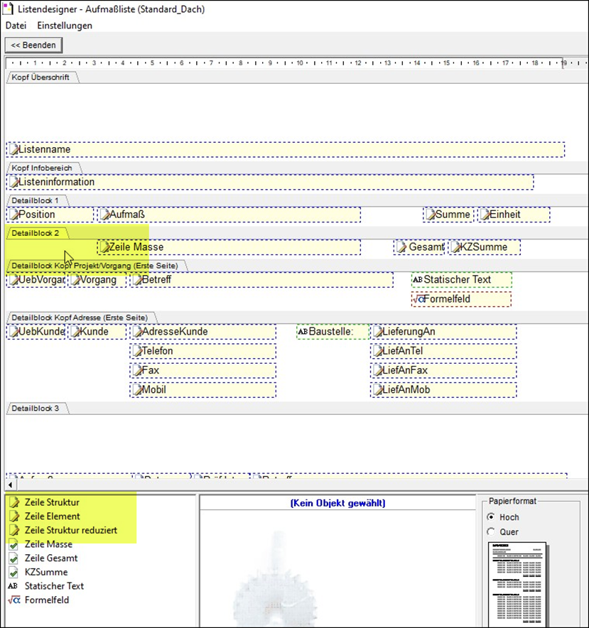 Beim Druck der Aufmaßliste zu einem Aufmaßbuch können nun im Abschnitt Detailblock 2 die Platzhalter „Zeile Struktur“, „Zeile Element“ und „Zeile Struktur reduziert“ verwendet werden.