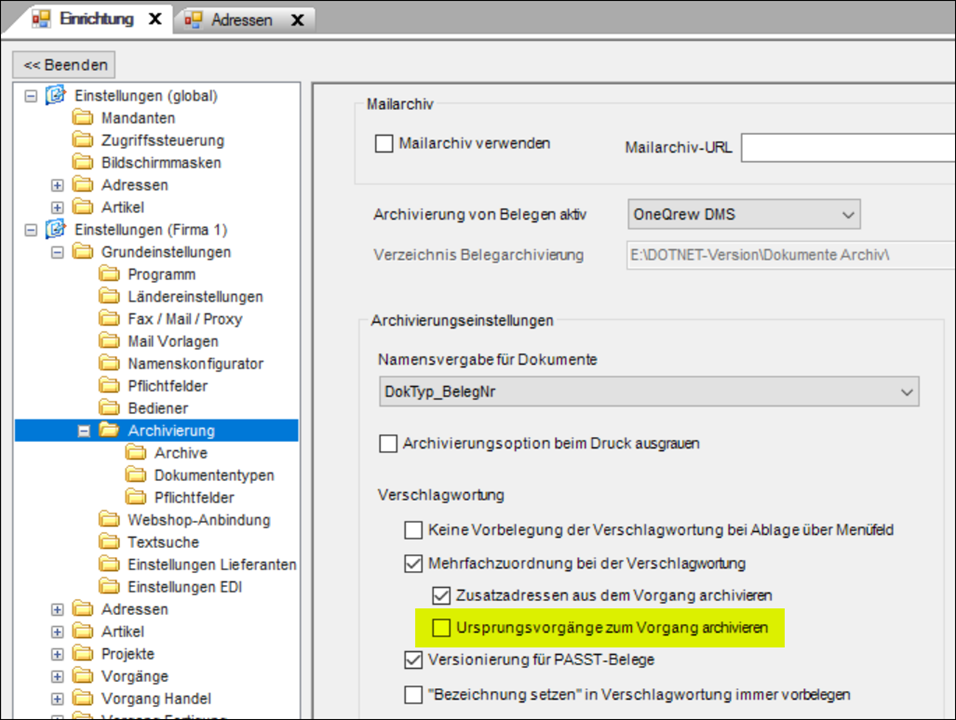 In der Einrichtung unter „Archivierung / Verschlagwortung“ wurde ein neuer Parameter namens „Ursprungsvorgänge zum Vorgang archivieren“ eingeführt, der standardmäßig deaktiviert ist und die Archivsysteme ELO, M-Soft DMS und OneQrewDMS betrifft.