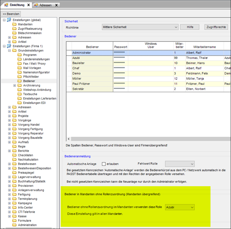 In der Einrichtung unter Grundeinstellungen Bediener kann nun eine Rolle vorbelegt werden, die verwendet wird, wenn ein Bediener keiner spezifischen Rolle zugeordnet ist. So wird sichergestellt, dass Bediener in neuen Mandanten keine oder nur minimale Rechte erhalten oder dass neue Bediener auf ihren Mandanten eingeschränkt sind.