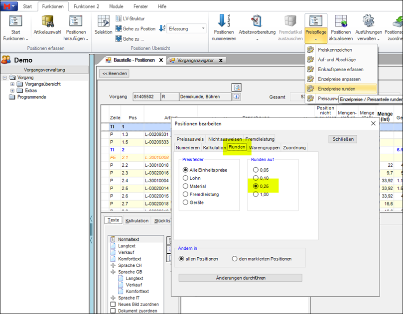 Mit der Funktion Preispflege-Einzelpreise runden können die Preisfelder nun auf 0,25 als Nachkommastellen geändert werden. Das heißt die Nachkommawerte werden auf glatte Werte, 25, 50 oder 75 gerundet.