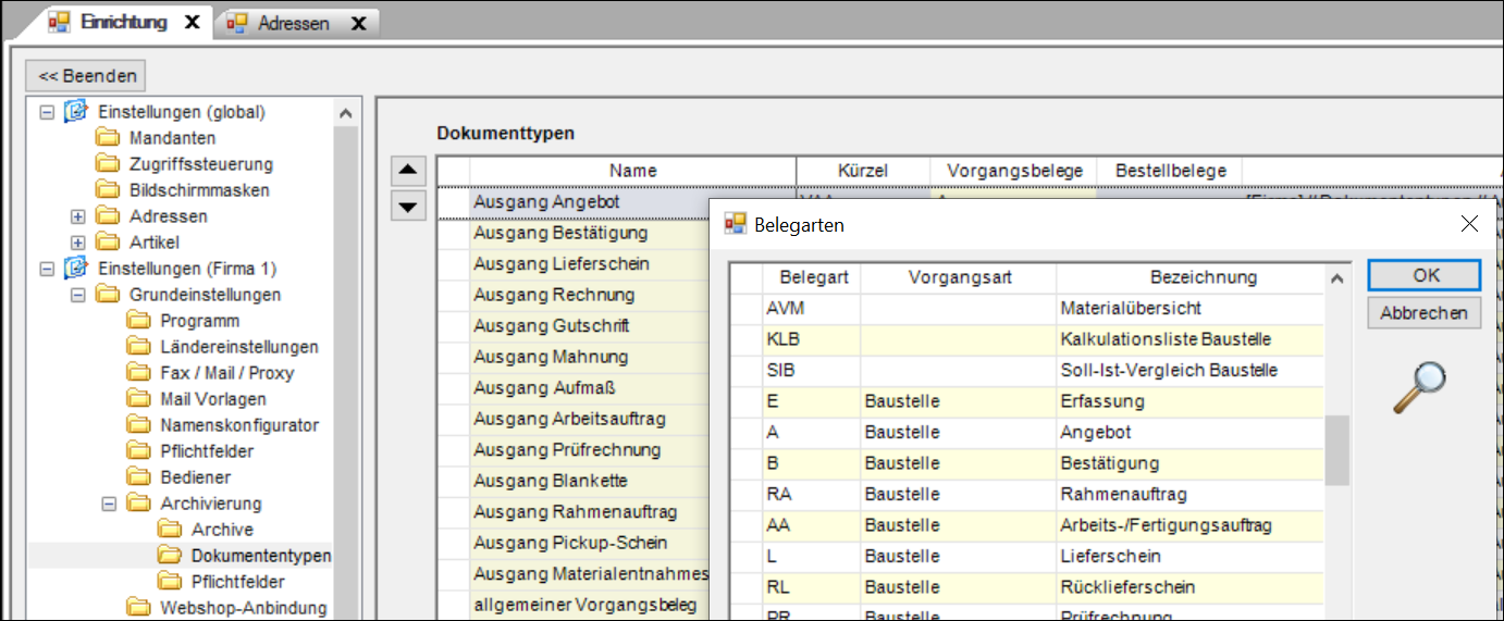 Dazu stehen in der Einrichtung / Archivierung / Dokumententypen neue Dokumententypenzuordnung zur Verfügung (ELO, M-Soft DMS und OneQrewDMS).