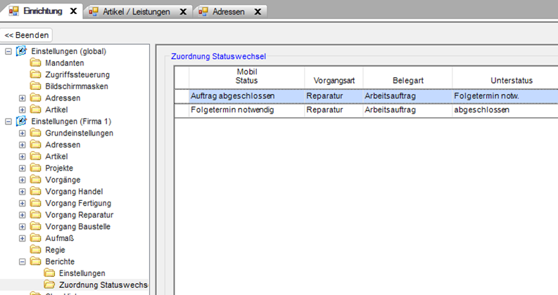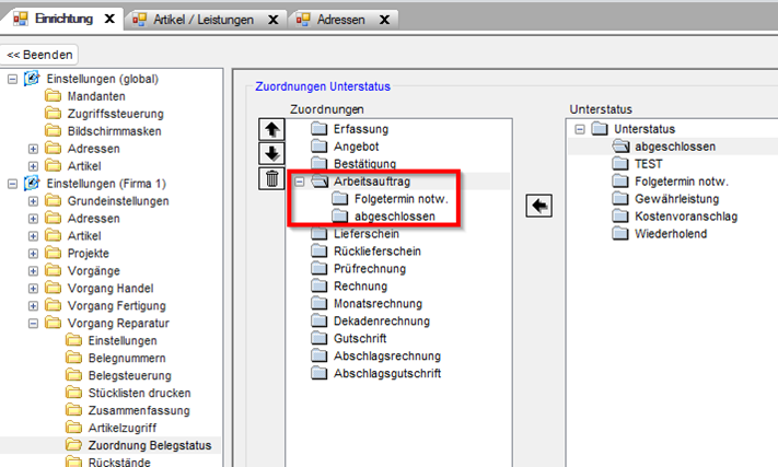 - Zuordnung Unterstatus [PASST.prime: Modul Stammdaten: Einrichtung: Vorgang Reparatur: Zuordnung Belegstatus]