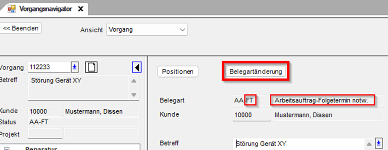 - Die Belegart (z.B. AA Arbeitsauftrag) wird dabei NIE verändert