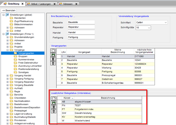 - Anlage Unterstatus [PASST.prime: Modul Stammdaten: Einrichtung: Vorgänge: Vorgangsarten]