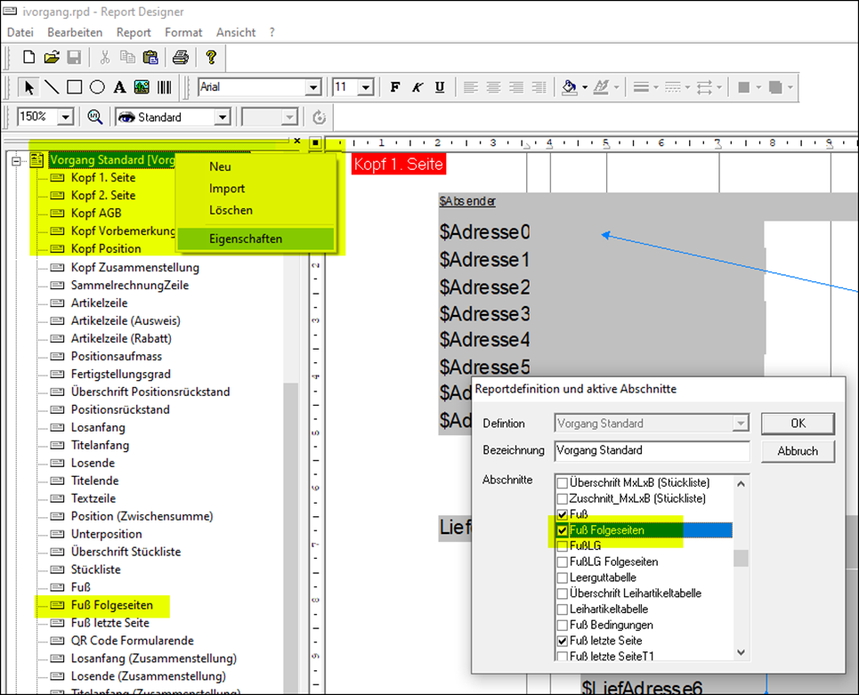 Mit der IVORGANG.RPD-Datei können Sie Ihre Belege über den Reportdesigner individuell anpassen. Belege werden in Abschnitte wie Kopf und Fuß unterteilt, die das Erscheinungsbild bestimmen. Der oberste Abschnitt lässt sich bereits zwischen der ersten und den Folgeseiten unterscheiden, durch „Kopf 1. Seite“ und „Kopf 2. Seite“. Jetzt ist es auch möglich, den Fuß zwischen „Fuß“ und „Fuß Folgeseiten“ zu differenzieren. Möchten Sie beispielsweise auf der ersten Seite einen größeren Bereich reservieren, können die Folgeseiten eine geringere Höhe haben, wodurch mehr Platz für die Rechnungsdarstellung zur Verfügung steht.