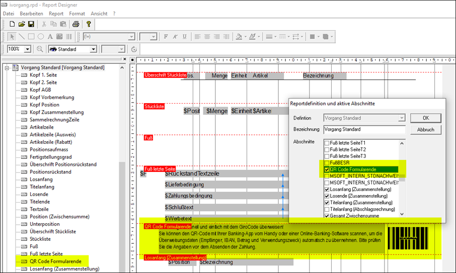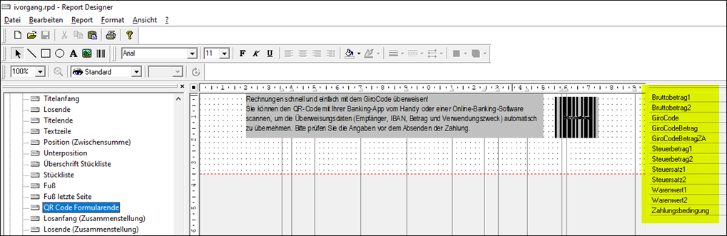 Im Formularabschnitt können diese Variablen verwendet werden: Bruttobetrag1, Bruttobetrag2, GiroCode, GiroCodeBetrag, GiroCodeBetragZA, Steuerbetrag1, Steuerbetrag2, Steuersatz1, Steuersatz2, Warenwert1, Warenwert2 und Zahlungsbedingung.