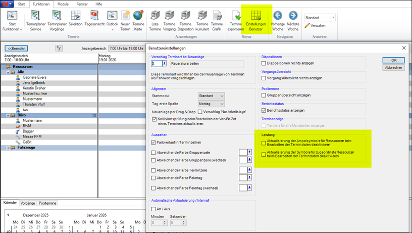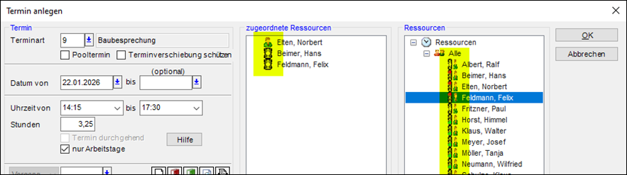 Mit aktivierter Kollisionsprüfung wird für jede Ressource (bzw. Mitarbeiter) überprüft, ob der Termin mit anderen Terminen überlagert. Bei einer großen Anzahl von Mitarbeitern im System kann dies zu spürbaren Verzögerungen bei der Terminerstellung führen.