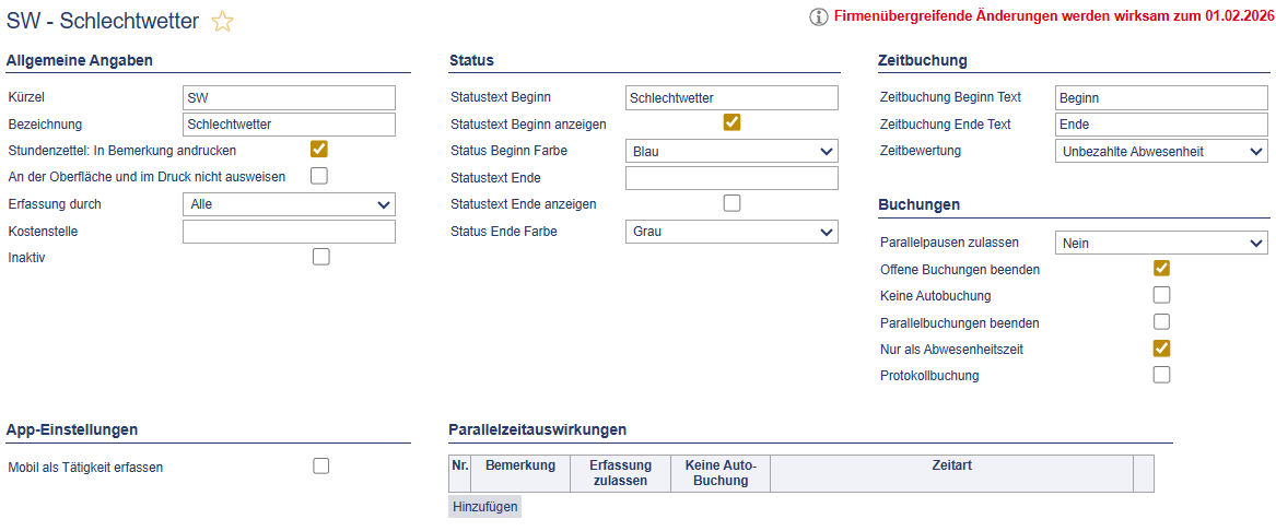 - Abwesenheitsart (spiegelt Bewertung/Logik der Zeitart in der Zeiterfassung)