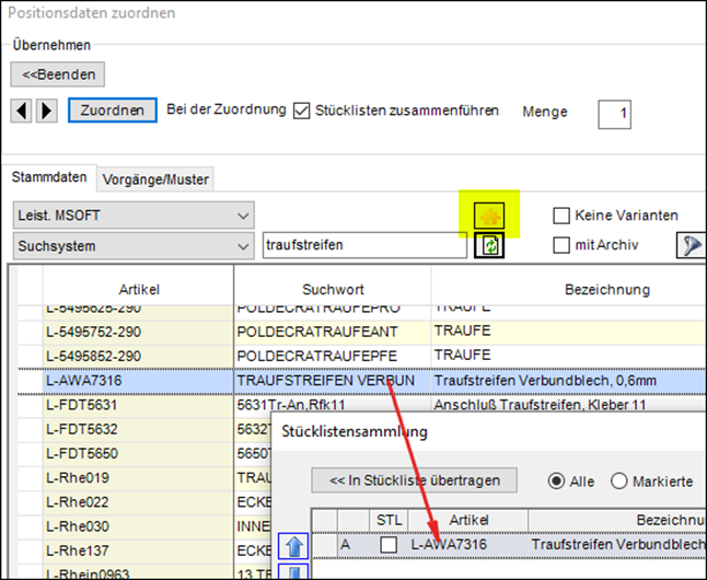 Mit dem Button „<< In Stückliste übertragen“ werden entweder alle oder die markierten Einträge in die Stückliste der aktuellen Vorgangsposition kopiert.
