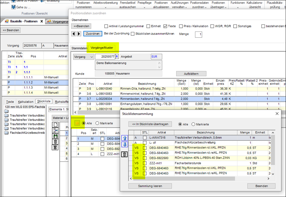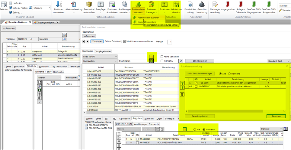 Mit der Funktion „Positionsdaten zuordnen“ können Stücklisten von Leistungspositionen angepasst werden. Die neue Funktion Stücklistensammlung ermöglicht es, Stammartikel, Stücklisten aus Stammartikeln und Positionen in einer Liste zu organisieren und eine Auswahl daraus in die Stückliste einer Vorgangsposition zu kopieren.