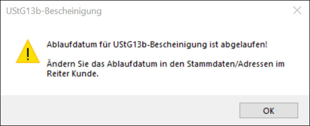 Hinweis: Ist kein Datum im Feld "UStG13b gültig bis" eingetragen, können Bestätigungen und Rechnungen für Vorgänge mit den Rechnungsarten "Inland Bauleistung" oder "Ausland EU Bauleistung" weiterhin gedruckt werden.