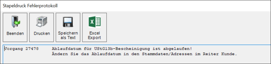 Die Prüfung des Ablaufdatums wird auch beim Stapeldruck berücksichtigt. Nicht druckbare Vorgänge werden am Ende des Stapeldrucks im Protokoll vermerkt.