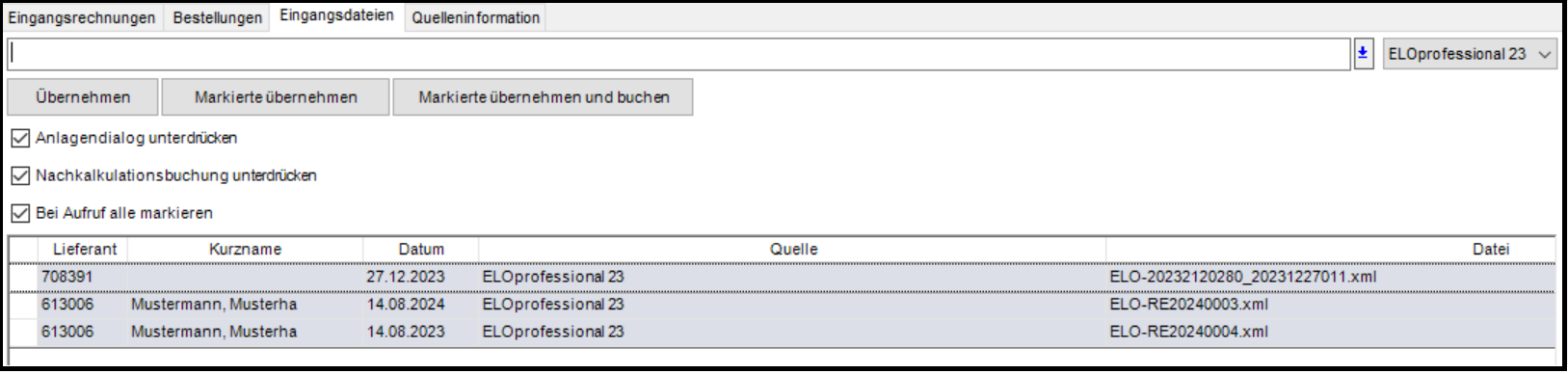 Ergänzend dazu wurde die Funktionalität „Bei Aufruf alle markieren“ geschaffen. Diese Erweiterung sorgt dafür, dass sofort nach dem Laden der Eingangsdateien sämtliche Listeneinträge automatisch ausgewählt sind. Die bisher notwendige manuelle Selektion der Tabellenzeilen per Maus entfällt dadurch vollständig. In Kombination mit den Unterdrückungs-Optionen und den Übernahme-Buttons ermöglicht dies eine effiziente Bearbeitung: Mit nur einem Klick kann nun die gesamte Liste der Rechnungen in einem Rutsch erfasst und verbucht werden. Auch diese Einstellung ist dauerhaft und bleibt für zukünftige Aufrufe gespeichert, sodass die Tabelle beim Öffnen stets im vollständig markierten Zustand bereitsteht.